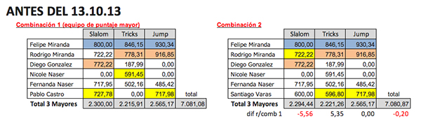 En resumen con Pablo (en vez de Santiago) el equipo ganaba 5,56 puntos en slalom y perdía 5,35 puntos en figura, o sea el equipo ganaba 0,20 puntos netos (7.081,08 con Pablo respecto de los 7.080,87 con Santiago).