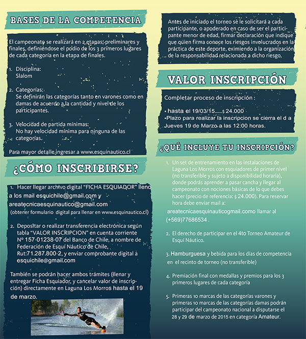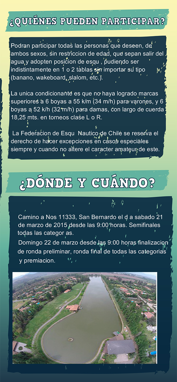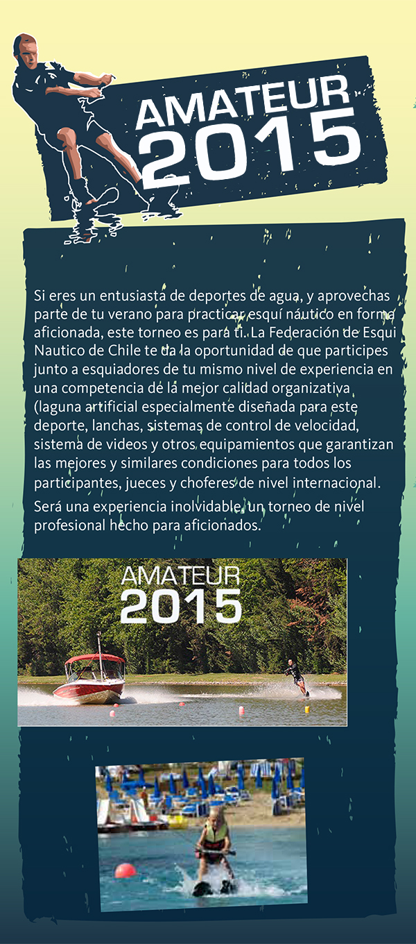 Amateur 2015 Fecha: sábado 21 y domingo 22 de marzo de 2015. Lugar: Lago Los Morros de San Bernardo (Camino Nos, 11.333) Ficha de Inscripción: DESCARGAR Bases: DESCARGAR Lista de inscritos: AVANZADO – MEDIO – NOVICIO