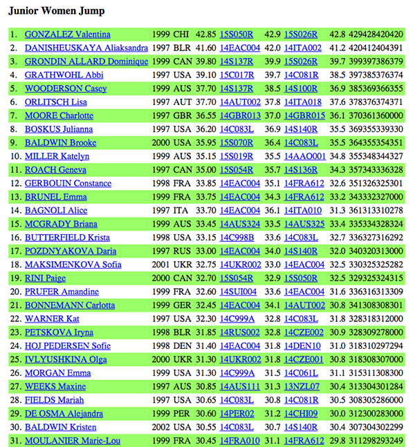 La campeona Odesur brincó desde el segundo lugar a la posición más alta del escalafón merced a un promedio de 42,85 metros, luego de inscribir como mejores marcas saltos de 42,9 y 42,8 en el periodo comprendido entre el 1 de noviembre de 2013 y el 31 de octubre de 2014.