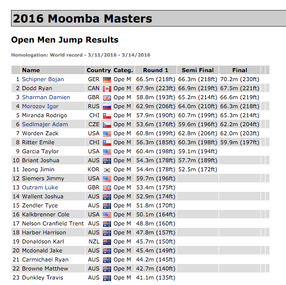 En la final de salto también se presentó el nacional Emile Ritter, quien remató en la octava posición con 59,9 metros, marcando así un excelente precedente en su primera participación en la serie open del certamen.