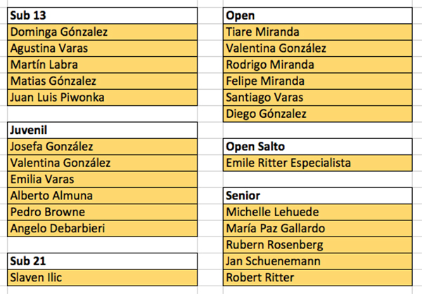 En sub21 actuará la joven promesa nacional Slaven Ilic, mientras que en open se presentarán los hermanos Felipe, Tiare y Rodrigo Miranda, Emile Ritter, Valentina González, Santiago Varas y Diego González. Completarán el equipo chileno en Santo Domingo, los seniors Michelle Lehuede, María Paz Gallardo, Rubén Rosenberg, Jan Schuenemann y Robert Ritter.