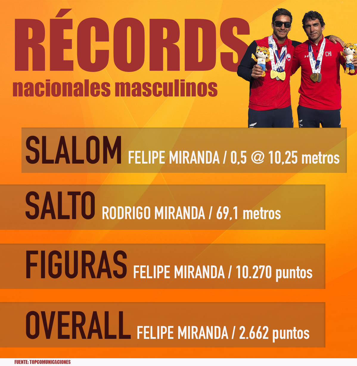El récord de Chile de slalom masculino lo poseía el propio Felipe Miranda, quien en octubre de 2006 estableció una marca de 5 boyas a 10,75 metros de cuerda.